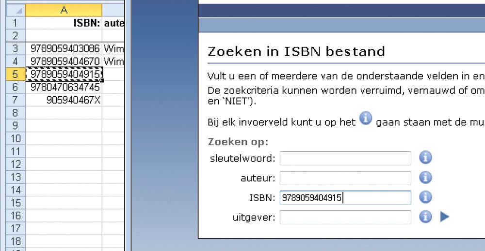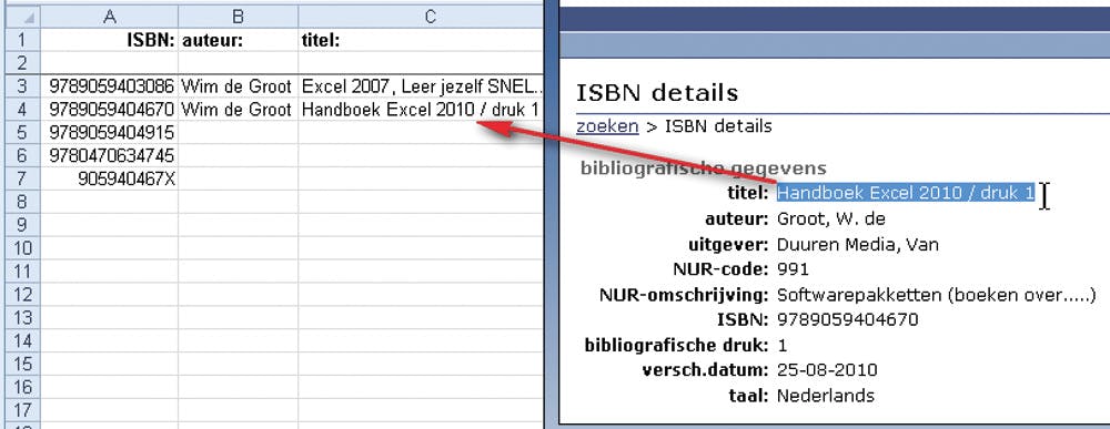 Hierna gaat u terug naar uw boekenlijst in Excel, neemt u een ander ISBN, herhaalt u de procedure om daarbij weer de gegevens te vinden enzovoort.