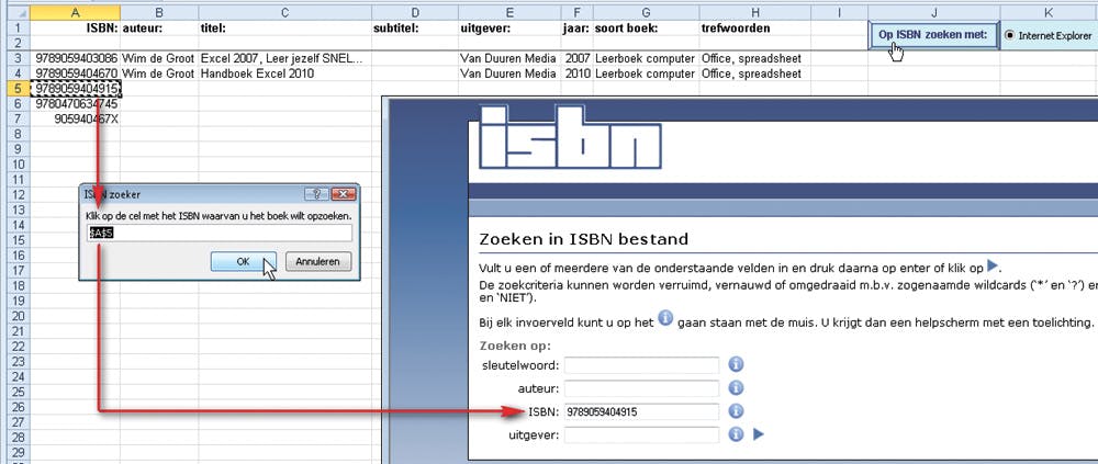 Klikt u op het keuzerondje Internet Explorer en dan op de knop ‘ISBN zoeken met:’, dan gaat er een venster open, waarin u een cel opgeeft waar het ISBN dat u zoekt in staat. U klikt eenvoudig op de cel met dat nummer. U hoeft dus geen nummer in dat venstertje te typen. En om het u helemaal gemakkelijk te maken, wordt automatisch alvast de cel gemarkeerd die op dat moment actief is. Met andere woorden: klikt u eerst op de cel met het ISBN en dan op de knop ‘ISBN zoeken met:’, dan staat die cel al meteen ingevuld. Klik op OK (of druk op Enter) en u gaat naar de website met het venster Zoeken in ISBN bestand. In dat venster staat het ISBN uit de cel van zopas al ingevuld (zie afbeelding 3).