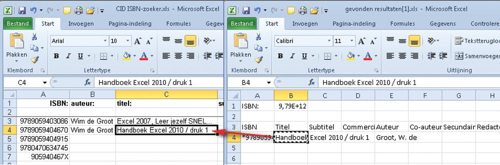 Hebt u nog niet alle gegevens gekopieerd, ga dan terug met Ctrl+F6, selecteer een andere cel (of cellen) en kopieer die op dezelfde manier naar uw boekenlijst. Gaan die sneltoetsen u te snel, dan kopieert u als volgt. Selecteer de cel (of cellen). Met Excel 2007 of 2010 klikt u in de tab Start op Kopiëren, in oudere versies van Excel op Bewerken, Kopiëren. Klik op Beeld, Ander venster (oudere versies: #Venster) en kies in de lijst die opengaat, CID ISBN-zoeker.xls. Klik in een cel naast het ISBN dat u hebt gezocht en klik op (Bewerken en) Plakken. Ziet het ISBN in dat werkblad eruit als 9,78906E+12, dan geeft Excel dat grote getal weer in de zogeheten wetenschappelijke notatie. Niets om u zorgen over te maken, het nummer staat immers al in de juiste opmaak in uw eigen lijst. Alles overgenomen? Dan kan het bestandje ‘gevonden resultaten.xls’ weg. Sluit dit bestand zonder het op te slaan (zie afbeelding).