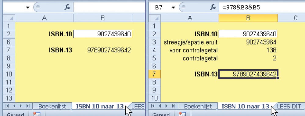Op 1 januari 2007 is men van een systeem met 10 cijfers overgestapt naar een systeem met 13 cijfers. In de meeste gevallen zal het zoekvenster van de website dat we hier bespreken, een ISBN van 10 cijfers automatisch converteren; u ziet dat onder Gevonden resultaten. Hebt u een ISBN van 10 cijfers en wilt u dat zelf converteren om ergens anders te zoeken? U kent ons toch: daar hebben we een hulpmiddeltje voor gemaakt. Klik op de bladtab ‘ISBN 10 naar 13’ onder in beeld. Daar voert u in het witte vak het ISBN in van 10 cijfers en zodra u op Enter drukt, ziet u het ISBN in 13 cijfers eronder. Spaties en streepjes worden verwijderd, dat zoekt makkelijker op internet. Dat omrekenen gebeurt in vier stappen, met formules die we hebben verborgen in rij 3 tot en met 5. Wilt u ze zien, selecteer dan rijnummer 2 tot en met 6, klik met de rechtermuisknop en kies Zichtbaar maken. Als u dan op een van de getallen in kolom B klikt, ziet u de formule in de formulebalk (zie afbeelding). Hoe het converteren van 10 naar 13 cijfers precies in elkaar steekt, leest u als u op www.google.nl als zoekterm isbn 10 13 wiki opgeeft.