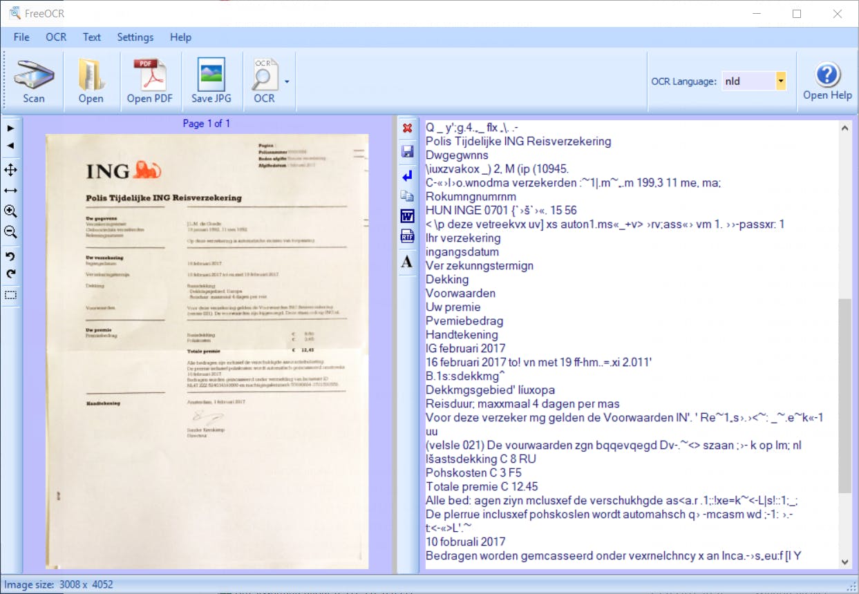 Wil je betere kwaliteit of bijvoorbeeld brieven snel digitaliseren, dan kun je beter een scanner gebruiken. Met name voor brieven is ocr handig, software die bij een aantal scanners standaard wordt meegeleverd. Ocr staat voor optical character recognition, oftewel optische karakterherkenning. Daarmee wordt een afbeelding omgezet naar tekst. Een gratis programma dat dit kan is FreeOCR voor Windows. Helaas is die wel voor het laatst bijgewerkt in 2015. Je downloadt FreeOCR hier. Installeer en open het programma. Klik bovenaan op Open PDF om een pdf te openen of klik op Open om een afbeelding te openen (bijvoorbeeld als je je brief als jpg-bestand hebt laten opslaan). Klik rechts bij OCR Language op nld en klik dan op de OCR-knop om de afbeelding om te zetten in tekst. Het resultaat kan per document sterk verschillen. Als het resultaat goed genoeg is, kun je bijvoorbeeld apart dat opslaan als txt-bestand naast de scan. Voor optimale resultaten: zorg ervoor dat je in zo hoog mogelijke resolutie scant (zie tip 7), maar let wel op dat er dan erg veel opslagruimte kan worden gebruikt.