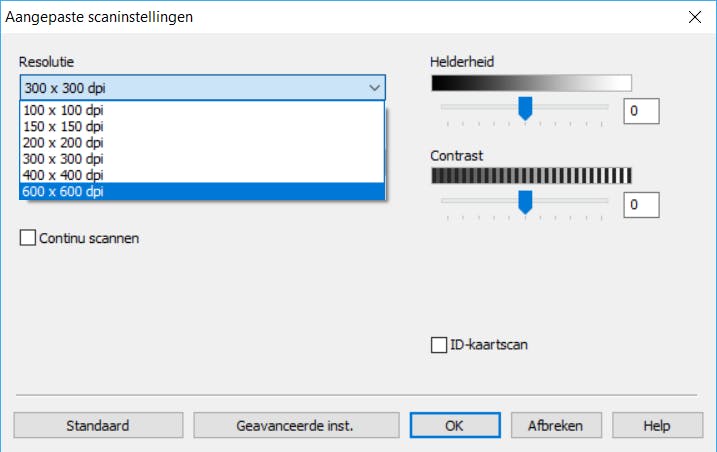 De resolutie van scans wordt getoond in dpi: dots per inch. Dit bepaalt de resolutie en daarmee de kwaliteit van je afbeelding. Hoe hoger de dpi, hoe hoger de kwaliteit, maar ook hoe langer het duurt voordat de scanner klaar is en hoe meer opslagruimte de scan kost. Dus: te hoog en je zit lang te wachten én je opslagruimte is zo op, te laag en je gescande document is een blokkenfestijn. Over het algemeen is het zo dat voor brieven en facturen een dpi van 300 een goede balans is tussen kwaliteit en snelheid. Voor foto’s wil je al snel gaan voor iets als 600 dpi of hoger. Vegatieven of echt kleine foto’s die je groter wilt kunnen tonen, neem je simpelweg de maximum-dpi van je scanner.