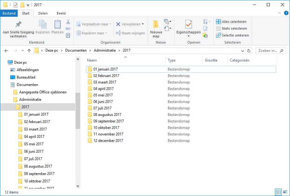 Een logische mappenstructuur is afhankelijk van wat jij prettig vindt. Voor brieven is bijvoorbeeld de structuur jaar / maand (en eventueel / dag), dus dan krijg je binnen de map 2017 alle maanden. Tip: geef die maanden een nummer zodat ze op volgorde verschijnen in je mappenstructuur, en voeg eventueel ook weer het jaartal toe, handig om het overzicht te bewaren. Heb je erg veel bestanden, dan krijg je binnen de map 01 januari weer alle dagen. Daarna is het een kwestie van het bestand hernoemen en in een logische mappenstructuur plaatsen. Dat hernoemen is ook iets waar je aandacht aan moet besteden: geef je bestanden een consistente naam. Als je meerdere naamtypen door elkaar gebruikt, wordt het snel moeilijk om je bestanden terug te vinden. Denk hier vooraf over na: het achteraf wijzigen is veel werk. Een standaardnaamgeving kan zijn bedrijf_onderwerp.pdf voor brieven of aankoopdatum_modelnr_type-apparaat.pdf.