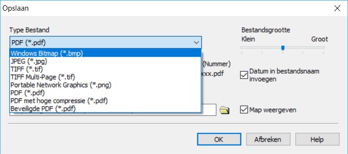 Je kunt bijvoorbeeld in scansoftware voor verschillende bestandstypen kiezen bij het opslaan van je bestanden. Welke bestandsindeling het beste is, hangt af van je eisen en mogelijkheden. Als je heel veel opslagruimte hebt, dan kun je kiezen voor tiff voor je foto’s. Daarmee blijft de kwaliteit behouden, want tiff past geen compressie toe. Voor brieven is er maar één geschikte indeling: pdf. Het fijne aan pdf is dat een document meerdere pagina’s kan bevatten en dat het formaat ondersteuning biedt aan ocr om de bestanden gemakkelijk te kunnen doorzoeken. Voor bonnetjes kun je pdf gebruiken, of iets als jpeg of png. Let wel op dat jpeg veel compressie toepast, waardoor de kwaliteit slecht kan zijn. Test dus altijd even of je bestanden nog leesbaar zijn.