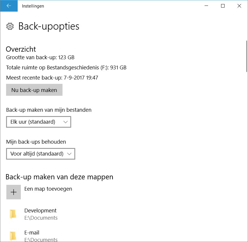 Als je al je documenten scant en digitaal opslaat, wil je wel zekerheid dat de documenten goed zijn opgeslagen. Het is belangrijk om back-ups te maken. Dat kan op verschillende manieren. De eenvoudigste manier is om de ingebouwde back-upfunctie van Windows te gebruiken. Daarvoor ga je naar de app Instellingen in Windows 10 en dan naar Bijwerken en beveiliging / Back-up. Klik op Een station toevoegen en kies een (externe) schijf uit de lijst. Klik dan op Meer opties. Zorg dat bij Back-up maken van deze mappen de map met je documenten er tussenstaat. Is dat niet het geval, voeg deze dan zelf toe met de knop Een map toevoegen. Klik eventueel op Nu back-up maken om direct een back-up te maken.