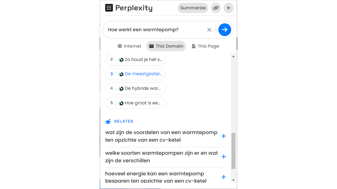 Perplexity.ai bespraken we ook al, en inmiddels kun je deze dienst als browserextensie installeren vanuit de Chrome Web Store. Je kunt de extensie bedienen met behulp van een knop, waar je de gewenste prompt kunt invoeren, ook in het Nederlands. Standaard is Internet geselecteerd, wat betekent dat Perplexity toegang heeft tot internetbronnen, vergelijkbaar met WebChatGPT. Je kunt echter ook This Domain of This Page selecteren, zodat de bot zich beperkt tot (links van) de geselecteerde bronnen.