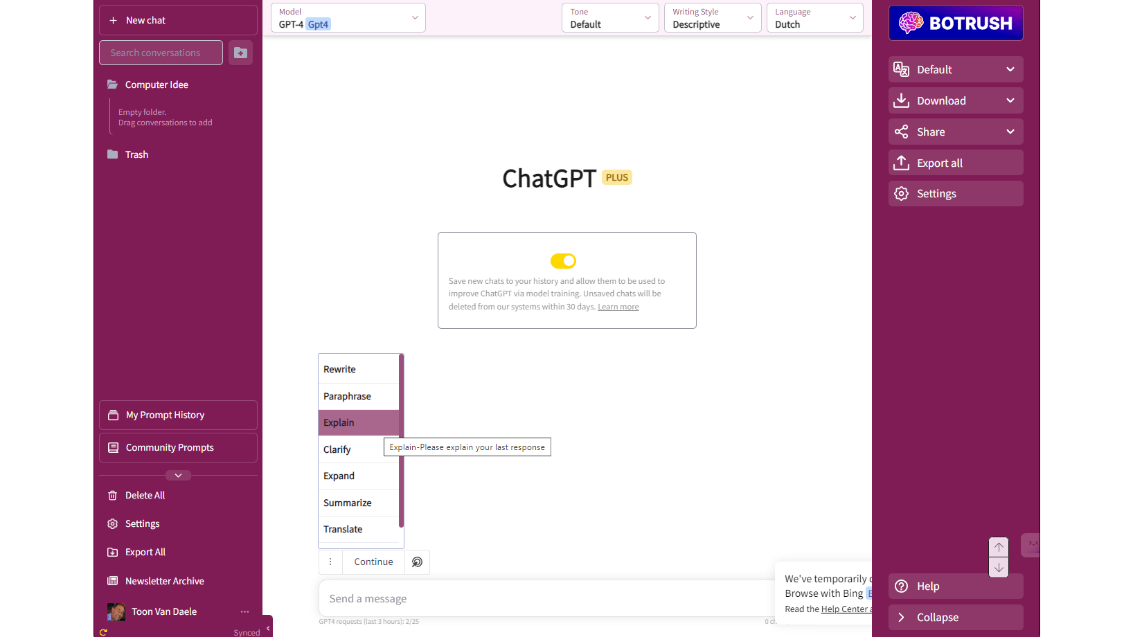 De Botrush Browser Plugin is primair bedoeld om de interface van ChatGPT aantrekkelijker te maken. Je kunt de interface op verschillende manieren aanpassen, met keuze uit vijftien kleurenschema’s en 25 lettertypen. Deze tool geeft ook het aantal tekens en woorden in een antwoord aan. Daarnaast stelt Botrush je in staat om elke respons direct te kopiëren in Markdown- of HTML-formaat en je kunt conversaties exporteren in verschillende formaten. Er is tevens een knop waarmee ChatGPT automatisch aanvullende informatie blijft geven na elk antwoord, totdat je deze knop weer uitschakelt. Net als SuperPower ChatGPT geeft ook Botrush je de mogelijkheid eigen ‘macro’s’ te creëren om zo sneller bepaalde responses op te roepen.