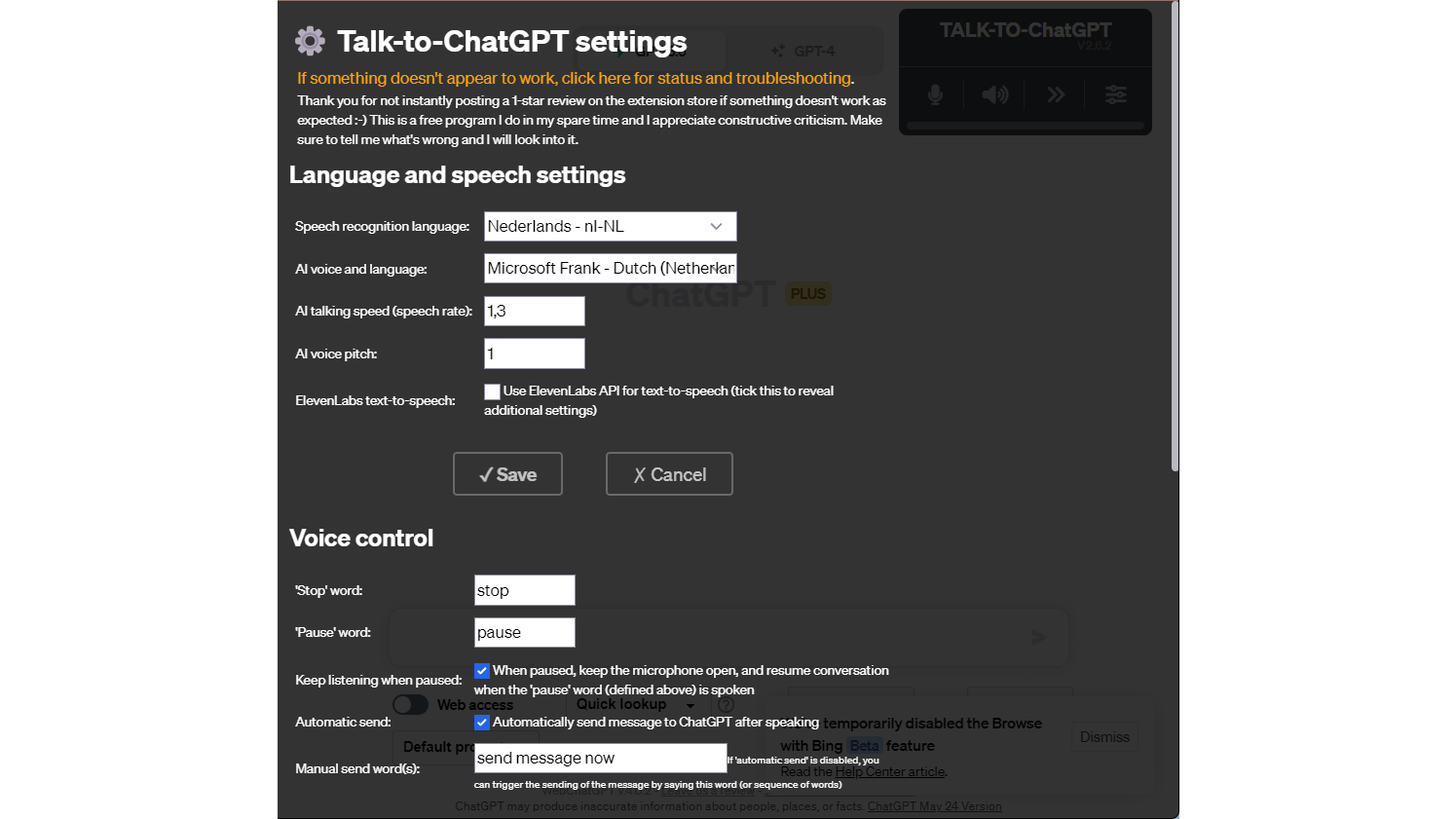 De extensie Talk-to-ChatGPT werkt zelfs in twee richtingen en ondersteunt eveneens verschillende talen, waaronder het Nederlands. Hiermee kun je niet alleen je prompts inspreken, maar worden de antwoorden van ChatGPT ook voorgelezen. Hoewel deze extensie nog niet helemaal perfect werkt, kun je er al goed mee aan de slag.