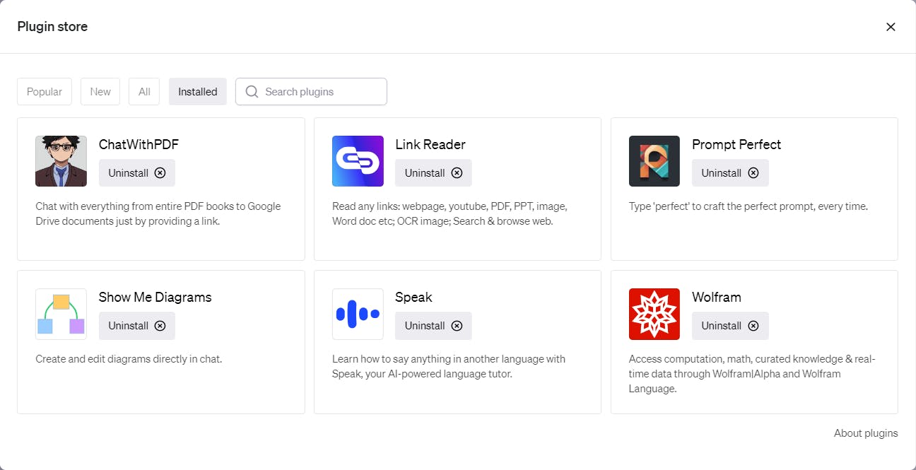 Op het tabblad All zie je een overzicht van alle beschikbare plug-ins. Op dit moment zijn dat er al meer dan zeshonderd en er worden dagelijks nieuwe toegevoegd. Er is ook een zoekbalk waarin je plug-ins kunt zoeken op basis van trefwoorden. Helaas is er momenteel geen thematische indeling beschikbaar, maar op het tabblad Popular vind je alvast een selectie van zestien veelgebruikte plug-ins, zoals Speak (om iets in een andere taal te zeggen), Scholar AI (om te zoeken in 40 miljoen wetenschappelijke documenten), Expedia (voor het plannen van reizen), Zapier (om te integreren met duizenden apps) en Link Reader (om links naar verschillende soorten documenten te ‘lezen’).