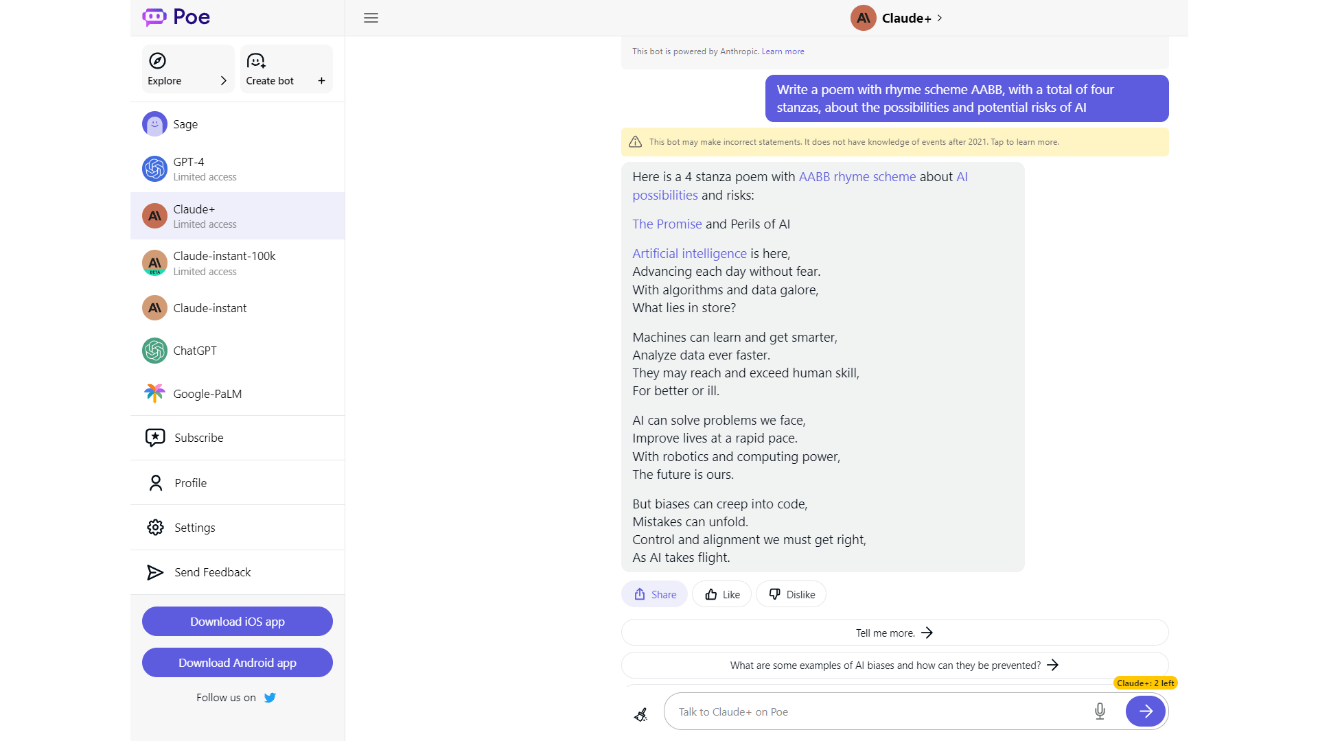 Je kunt ook naar https://chat.forefront.ai met je favoriete browser. Hier kun je niet alleen kiezen tussen GPT-3.5 en GPT-4, maar ook tussen Claude Instant en Claude+, weliswaar met een beperkt aantal prompts. Claude is een AI-assistent ontwikkeld door Anthropic en wordt in twee versies aangeboden, waarbij Claude Instant de lichtere maar ook snellere variant is. Je kunt GPT-4 en Claude+ ook uitproberen via de AI-chatbot Poe van Quora, op www.poe.com. Houd er ook hier rekening mee dat er sterke beperkingen gelden voor het aantal prompts. Een jaarabonnement met minimaal 600 GPT-4 en 1000 Claude+ prompts per maand kost ongeveer 23 euro per maand, net als bij ChatGPT Plus.