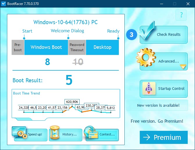 De installatie van het programma heb je zo voor elkaar; laat liefst alle vinkjes staan op het einde van het installatieproces. Wanneer je vervolgens je pc herstart, schiet BootRacer in actie. Bij elke opstart verschijnt een pop-upvenster waarin je afleest hoelang het bootproces precies duurde. BootRacer houdt daarbij zowel rekening met de systeeminitialisatie (waaronder het opstarten van services) als de voorbereiding van het Bureaublad en de uitvoer van autostarts. Standaard voert BootRacer deze analyse bij elke Windows-opstart uit, maar dat kun je desgewenst uitschakelen (via Advanced / Options / Only once). Een History-knop geeft je zicht op de evolutie van de opeenvolgende systeemstarttijden.