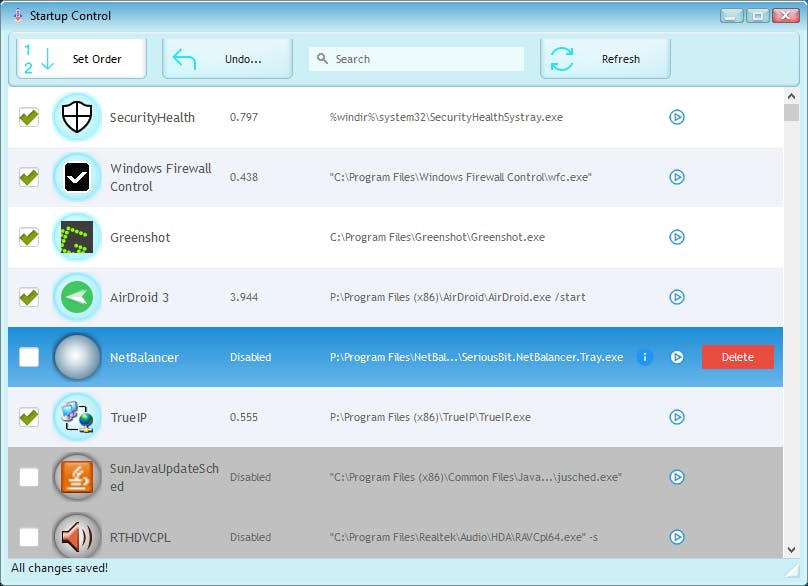 De tool laat je tevens toe ongewenste autostarts uit te schakelen: het volstaat het vinkje te verwijderen naast een gewraakt item. Of je verwijdert het permanent met de Delete-knop. Via pijltjesknoppen kun je verder de opstartvolgorde van de autostarts aanpassen.