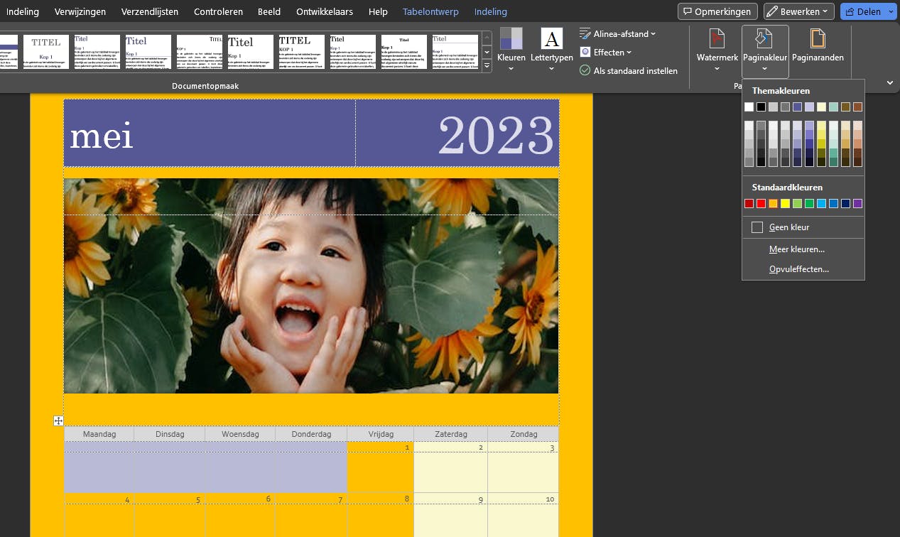 In een slechts een paar stappen voeg je een achtergrond toe. Deze achtergrond is wel van toepassing op het volledige document, dus ook op de volgende pagina’s. Laten we beginnen met een eenvoudige achtergrondkleur. Gebruik het tabblad Ontwerpen. Helemaal rechts in het lint staat de knop Paginakleur. Klik op het pijltje onder deze knop om een kleur te selecteren. Vind je de kleur die je nodig hebt niet, dan klik je op Meer kleuren en kom je bij de kleurenkiezer, waar je volgens verschillende kleurmodellen een tint selecteert uit het Windows-palet. Het document wordt automatisch bijgewerkt met de nieuwe achtergrondkleur.