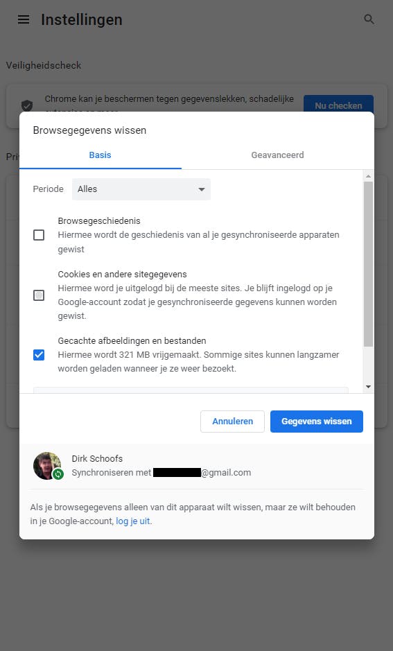 In Chrome klik je op de drie stippen in de rechterbovenhoek. Dan ga je naar Meer hulpprogramma’s en navigeer je naar Browsegegevens wissen. Bij Periode kies je Alles en dan haal je de vinkjes weg bij Browsergeschiedenis en Cookies en andere sitegegevens. Selecteer alleen Gecachte afbeeldingen en bestanden en klik op Gegevens wissen.