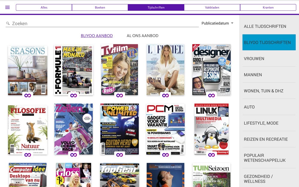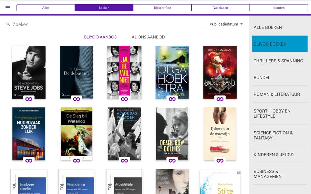 Bliyoo is te downloaden voor smartphones en tablets die Android en iOS draaien. De app is zelf gratis, waardoor je het hele Bliyoo-aanbod al van tevoren kan bekijken. Boeken en magazines die met een abonnement te lezen zijn, zijn voorzien van een paars Bliyoo-icoontje. Dat is handig, want zo kun je alvast kijken of er iets voor je tussen zit.