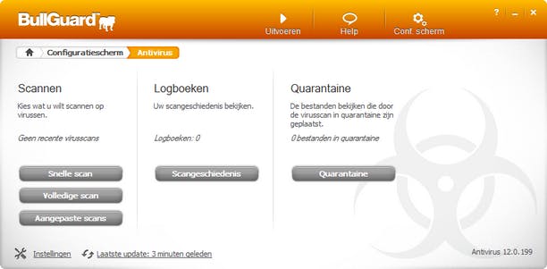 Versie 12 van BullGuard heeft zeer prettige nieuwe interface. Via een broodkruimelpad is altijd duidelijk waar u zich bevindt in het programma. Kleurcodering maakt de beveiligingsstatus van de computer inzichtelijk en een scan is nooit meer dan twee klikken weg. Wie zelf alles in wil stellen komt echter ook bij BullGuard niet onder een uitgebreider venster uit met opties voor updates, scans, spamfilter en het afhandelen van infecties.
