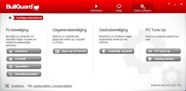 Alle onderdelen en opties van BullGuard Internet Security 12 zijn terug te vinden in het configuratiescherm.