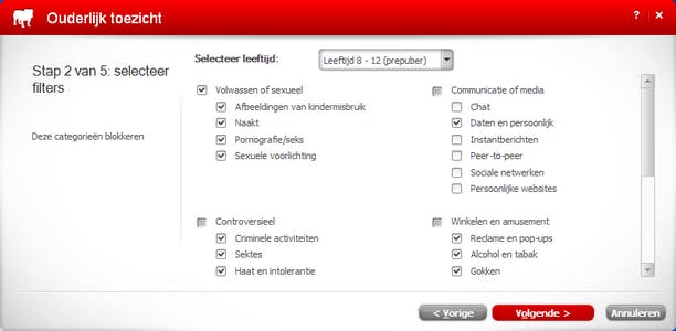 Het ouderlijk toezicht gebruikt de Windows-gebruikersprofielen en kan daar één van drie leeftijdscategorieën aan koppelen. De categorie bepaalt welke sites en informatie een gebruiker wel of niet mag zien. Het back-upprogramma kan zowel een back-up maken naar een cd/dvd of externe harde schijf, maar ook naar de 5 GB online opslagruimte die bij een BullGuard-abonnement meekomt. Daarbij biedt het opties de back-up te comprimeren en te versleutelen. Dat u zelf de sleutel kunt bepalen, heeft als nadeel dat wanneer u deze kwijtraakt niemand de data voor u kan openen, maar het voordeel is wel dat behalve u ook echt niemand erbij kan. Bij online opslag is dat laatste toch wel het beste.