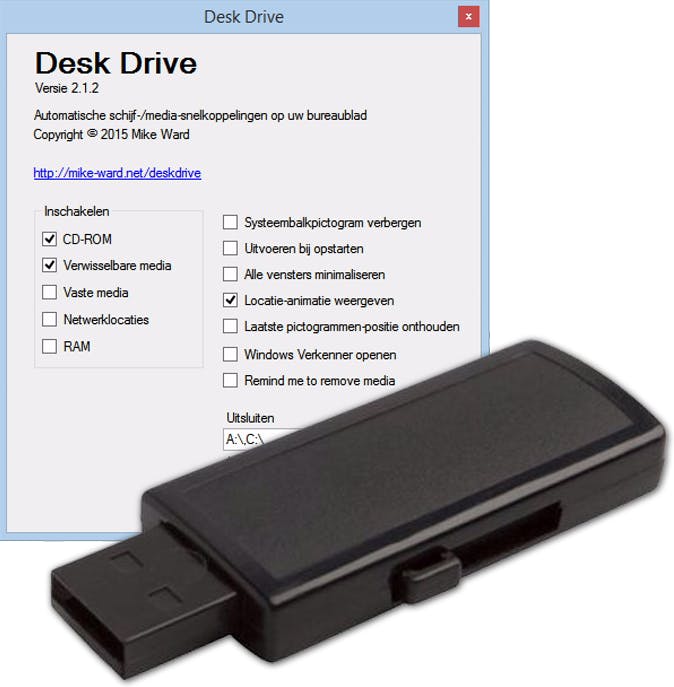 Optioneel kun je een vinkje plaatsen bij Windows Verkenner openen om al je verwisselbare media automatisch te openen. Als je schijfletters hebt die je wilt uitsluiten van Desk Drive kun je die bij de instellingen intypen. Desk Drive werkt ook met je externe harde schijf.