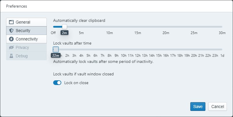 Je doet er wel goed aan de Security-rubriek bij de instellingen te controleren. Hier kun je namelijk instellen na hoeveel tijd het klembord – dat mogelijk een wachtwoord bevat –geleegd moet worden en wanneer een geopende kluis automatisch gesloten wordt. Het is ook veiliger om hier de optie Lock on close te activeren, om te vermijden dat een kluis geopend blijft nadat je de app hebt afgesloten. Blijkbaar is er ook een Privacy-rubriek, maar die is helaas niet toegankelijk. Vermoedelijk heeft dit te maken met een wat hobbelige release van de nieuwste app-versie, waarbij men er evenmin tijdig is in geslaagd ondersteuning in te bouwen voor een biometrische kluis-ontsluiting.