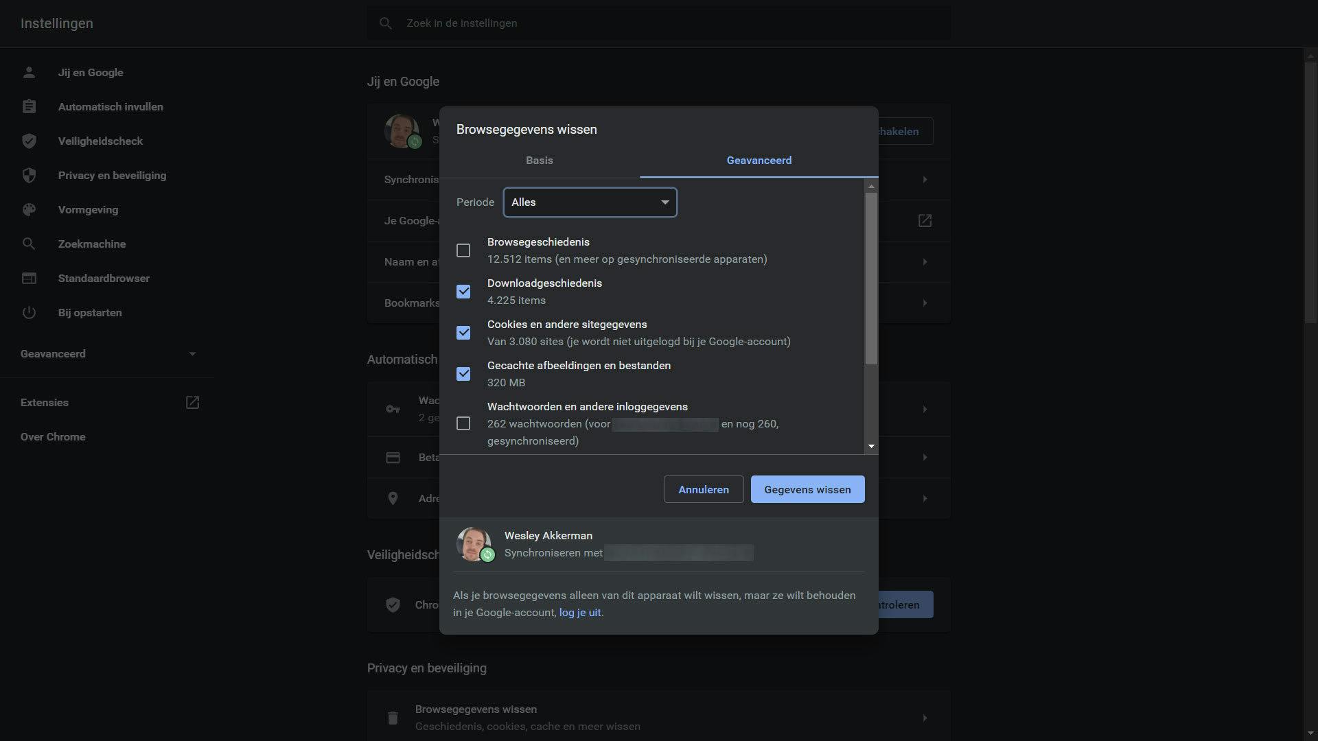 Rechts in de werkbalk van Google Chrome zie je drie puntjes staan. Klik daarop, schuif je muisaanwijzer naar Meer hulpprogramma’s en klik op Browsergegevens wissen. De instellingen worden geopend in een nieuwe tab, waar je binnen een ander venster de verschillende opties ziet staan. Vink aan wat je wil verwijderen en van welke periode (dat is een dropdownmenu met meerdere opties) en druk op Gegevens wissen.