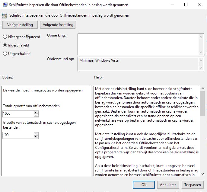 Als de editor is geopend, navigeer je naar Computerconfiguratie / Beheersjablonen / Netwerk / Offlinebestanden. In het rechtergedeelte van het dialoogvenster dubbelklik je op Schijfruimte beperken die door Offlinebestanden in beslag wordt genomen. Let erop dat bij dit item de status is ingesteld op Niet geconfigureerd. In dit venster activeer je de optie Ingeschakeld. Vervolgens kun je afhankelijk van de Windows-versie de waarde invullen in een percentage of in een aantal megabytes.