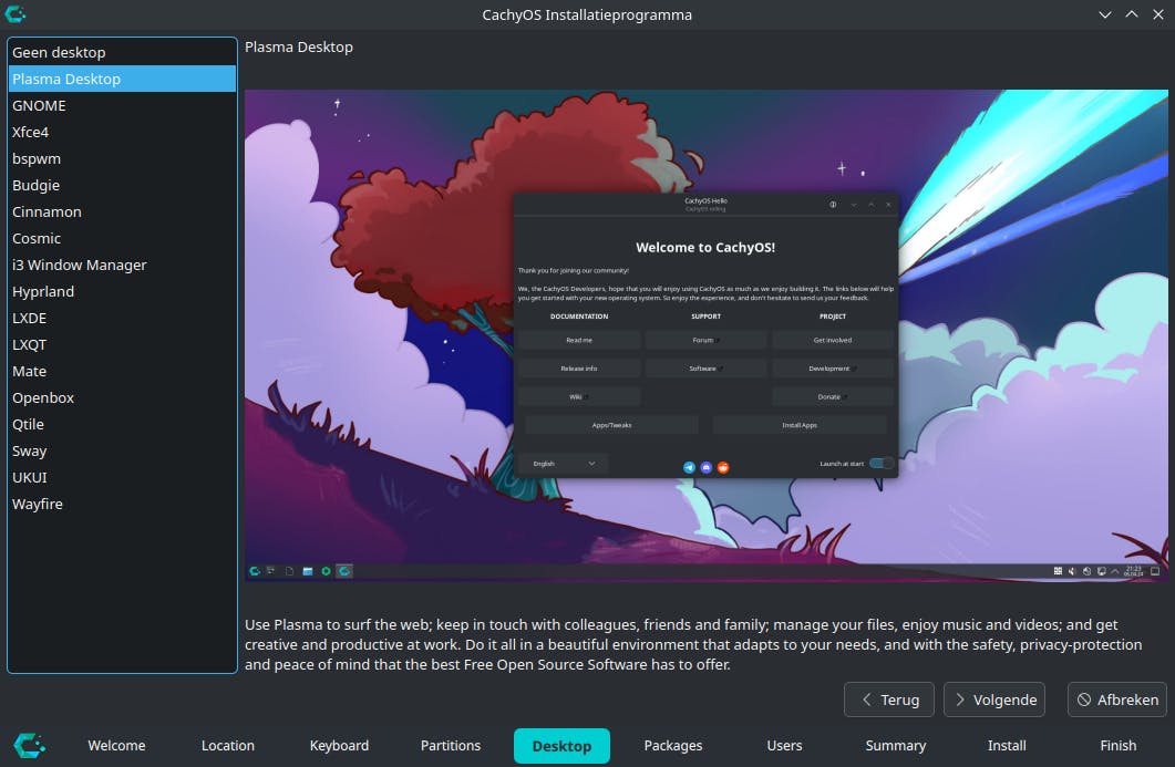 Het besturingssysteem is in allerlei sausjes beschikbaar. Voor deze workshop selecteren we Plasma Desktop, maar het staat je vrij om een ander uiterlijk te kiezen. In het volgende scherm voeg je eventueel extra onderdelen toe, al kan dat ook op een later moment. Laat de standaardinstellingen ongewijzigd en klik wederom op Volgende. Vul nu een naam, gebruikersnaam en computernaam in. Je bedenkt ook een wachtwoord. Via Volgende / Installeer / Install Now wordt de installatie uitgevoerd. Je zet na afloop een vinkje voor Nu herstarten en klikt op Voltooid.