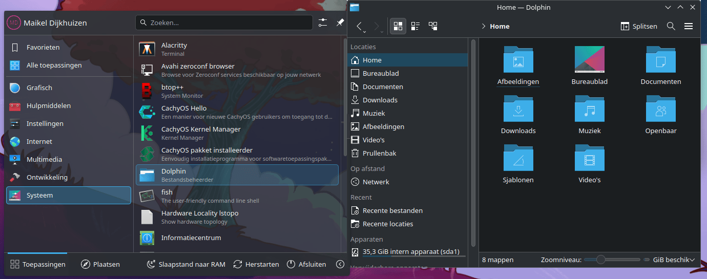 Wie Windows gewend is, hoeft vermoedelijk niet lang te wennen aan de navigatiestructuur. Klik linksonder op het logo van CachyOS om het startmenu te openen. Hier zijn flink wat applicaties over verschillende categorieën verdeeld. Kies bijvoorbeeld Systeem / Dolphin om een bestandsbrowser te openen. Hier vind je alle lokaal opgeslagen foto’s, video’s, documenten en overige bestanden. Daarnaast bevindt zich in Dolphin ook een prullenbak met verwijderde items.
