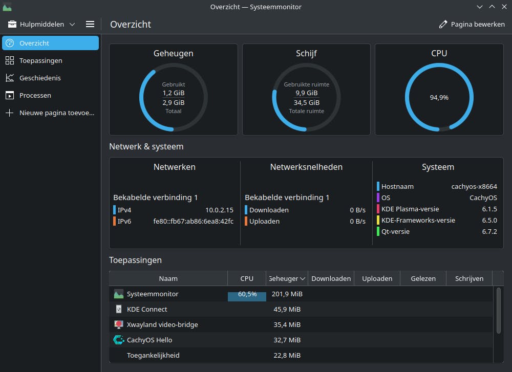 Elk besturingssysteem valt of staat met de beschikbare programma’s. Dat zit bij CachyOS wel goed. Er zijn zelfs een aantal nuttige tooltjes voorgeïnstalleerd. Zo gebruik je Cachy Browser om op internet te surfen en VLC Media Player om naar video’s te kijken. Verder vind je in het menu een fotoviewer (Gwenview), tekstverwerker (KWrite) en analyseprogramma (Systeemmonitor).