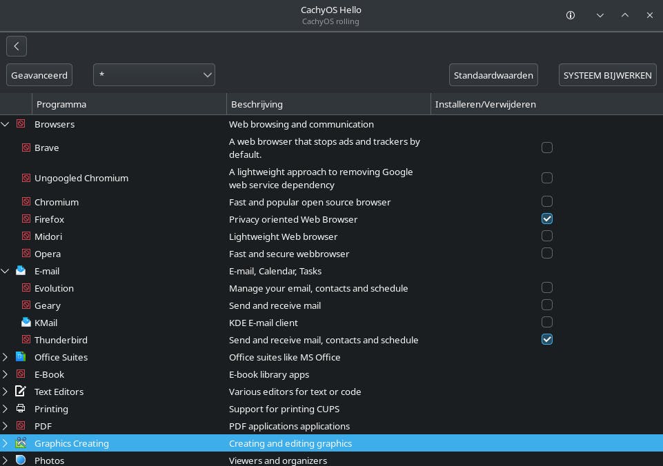 Je kunt in CachyOS nog veel meer toepassingen installeren. Klik in het welkomstscherm rechtsonder op Programma’s installeren. Er opent een venster met vijftien categorieën. Je klikt voor een categorie op het pijltje om de onderliggende tooltjes te tonen. Op die manier kom je allerlei vertrouwde namen op het spoor. Firefox is bijvoorbeeld een bekende browser, terwijl je met Thunderbird e-mailaccounts kunt beheren. Voor kantoortoepassingen is het LibreOffice-pakket een aanrader. Je komt daarnaast onder andere toepassingen voor e-bookbeheer (Calibre), fotobewerking (GIMP) en videomontages (Kdenlive) tegen. De keuze is reuze!
