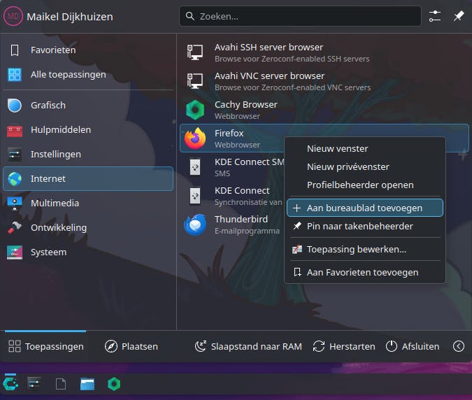 Buiten een fraaie achtergrond is het bureaublad van CachyOS verder helemaal kaal. Daar kun je eenvoudig iets aan doen. Creëer van je favoriete programma’s snelkoppelingen, zodat je ze voortaan vlot kunt opstarten. Navigeer in het startmenu naar een toepassing. Klik erop met de rechtermuisknop en kies Aan bureaublad toevoegen. Daarnaast kun je ook bestanden en mappen op het bureaublad plaatsen. Dat werkt simpel, want je sleept een map of bestand gewoon naar het bureaublad. Kies vervolgens in het contextmenu Hierheen verplaatsen, Hierheen kopiëren, of Hierheen verbinden.