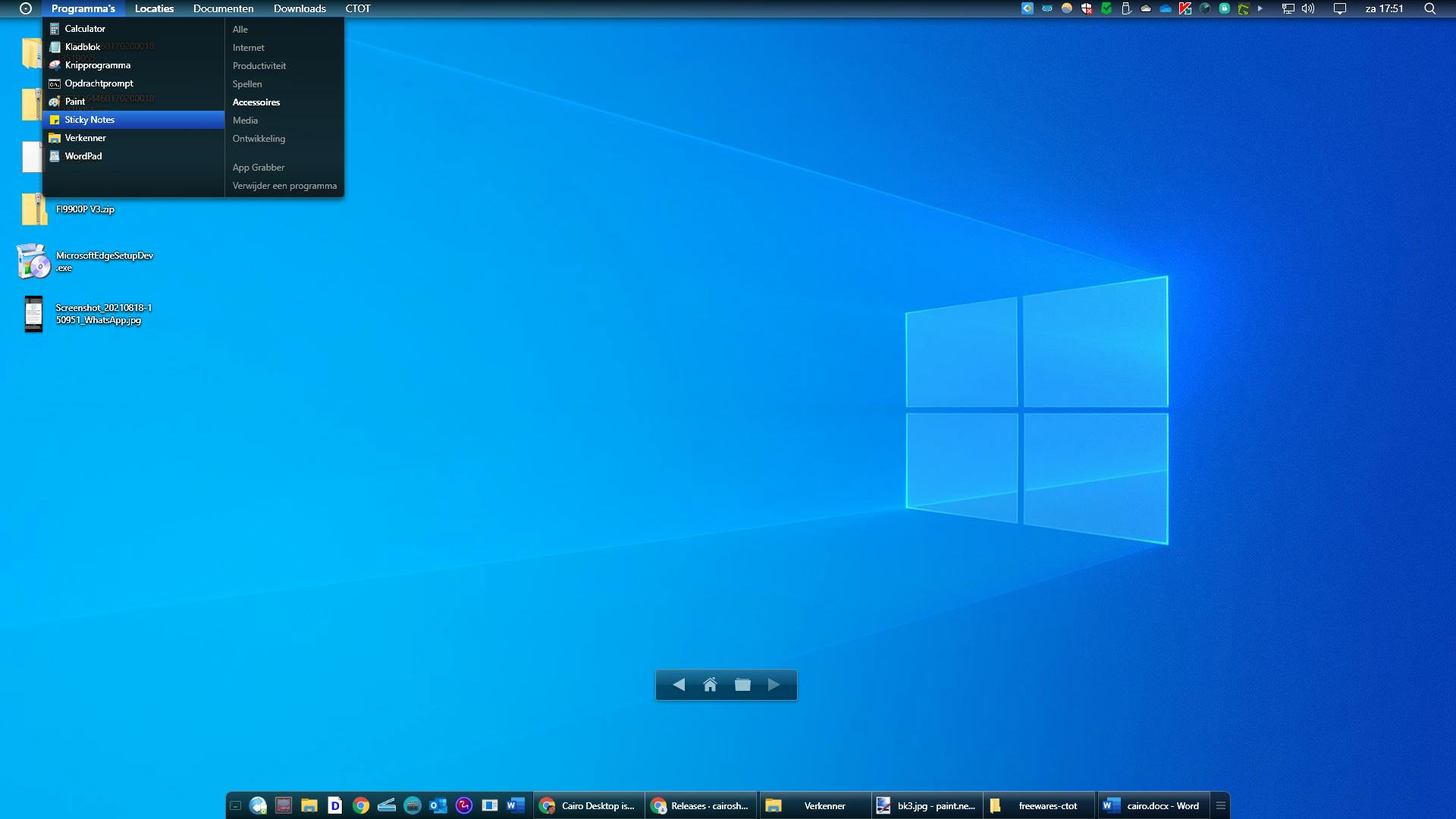 Ook de startknop van Windows is naar de bovenste uithoek verhuisd. Van hieruit kun je Cairo afsluiten (zodat je weer je oude bureaublad te zien krijgt), maar ook instellingen van de tool aanpassen om die helemaal naar je hand te zetten.