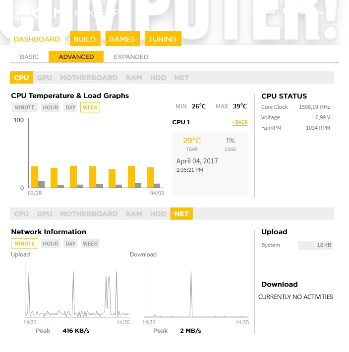 Op een ander tabblad wordt deze informatie nog verder uitgediept, voor zowel cpu, gpu, moederbord, ram als netwerkadapter. Je leest hier onder meer de S.M.A.R.T-waarden van je schijven af evenals de diverse voltages van je moederbord. Je krijgt bovendien een grafisch overzicht van de belasting van cpu, gpu, ram en netwerkadapter, van verschillende tijdspannes: uur, dag en week. Gamers zullen het prettig vinden dat ze nuttige informatie zoals gemiddeld en actueel aantal fps, cpu-, gpu- en ram-belasting als overlayvelden op hun gamescherm kunnen oproepen.