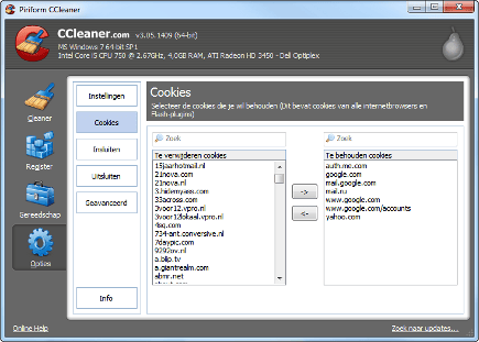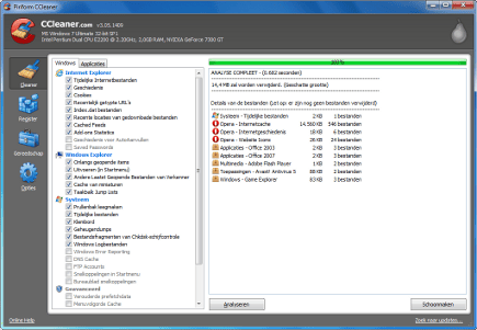 De grote populariteit van CCleaner is niet alleen te verklaren vanwege het aantal mogelijkheden en de snelheid ervan. Het tooltje is altijd zeer veilig gebleken, en daarnaast is het bedieningsgemak bijzonder groot. Wanneer we het programma starten, worden we geconfronteerd met een overzichtelijke interface. Aan de linkerkant treffen we hier de vier hoofdsecties van het programma aan: Cleaner, Register, Gereedschap en Opties. Met de functie Schoonmaken in de eerste sectie worden de in het linkerdeelvenster aangevinkte items verwijderd. De knop Analyseren biedt de mogelijkheid om eerst te bepalen wat CCleaner gaat verwijderen. Treft u iets aan dat u wilt bewaren, dan kunt u de ermee corresponderende optie in het linkerdeelvenster uitvinken alvorens u de schoonmaakactie uitvoert. De tweede sectie bevat de registercleaner. Hoewel het opschonen van het register naar ons idee tamelijk nutteloos is, is de registercleaner van CCleaner altijd zeer veilig gebleken, en u kunt deze dan ook met een gerust hart gebruiken. Het is wel aan te raden een back-up van de verwijderde items te maken. Voordat u de schoonmaakactie uitvoert zal CCleaner u hierom vragen. De sectie Gereedschap bevat vier opties. U kunt hiermee onder meer ongewenste opstartitems uitschakelen, en overbodige systeemherstelpunten verwijderen. Tevens kunt u met de in versie drie geïntroduceerde Drive wiper lege schijfruimte dan wel complete partities of schijven (uiteraard met uitzondering van de systeemschijf) grondig wissen. Tenslotte biedt de sectie Opties mogelijkheden om CCleaner aan uw wensen aan te passen. Onder Instellingen kunt u bijvoorbeeld opgeven dat er bij het opstarten van de pc moet worden opgeschoond. Verder hebt u hier de mogelijkheid bepaalde mappen, bestanden en/of registeritems uit te sluiten van het schoonmaakproces, dan wel deze eraan toe te voegen. En ten slotte bevat deze sectie een cookie-manager, waarin u kunt aangeven welke cookies op uw systeem bewaard dienen te blijven.