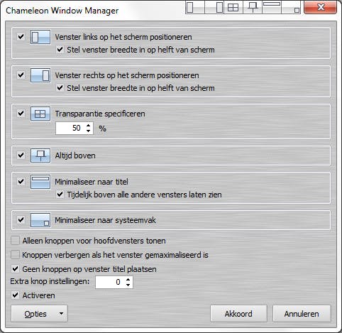 Chameleon Window Manager is een erg eenvoudige tool. Na de installatie wijzigt u de taal in het Nederlands en vanaf dan beheert u de extra knoppen vanuit slechts één configuratievenstertje. Aanvankelijk staan alle zes extra knoppen aangevinkt. U kunt ook selectief te werk gaan en zelf kiezen welke knoppen u wilt plaatsen en welke niet.