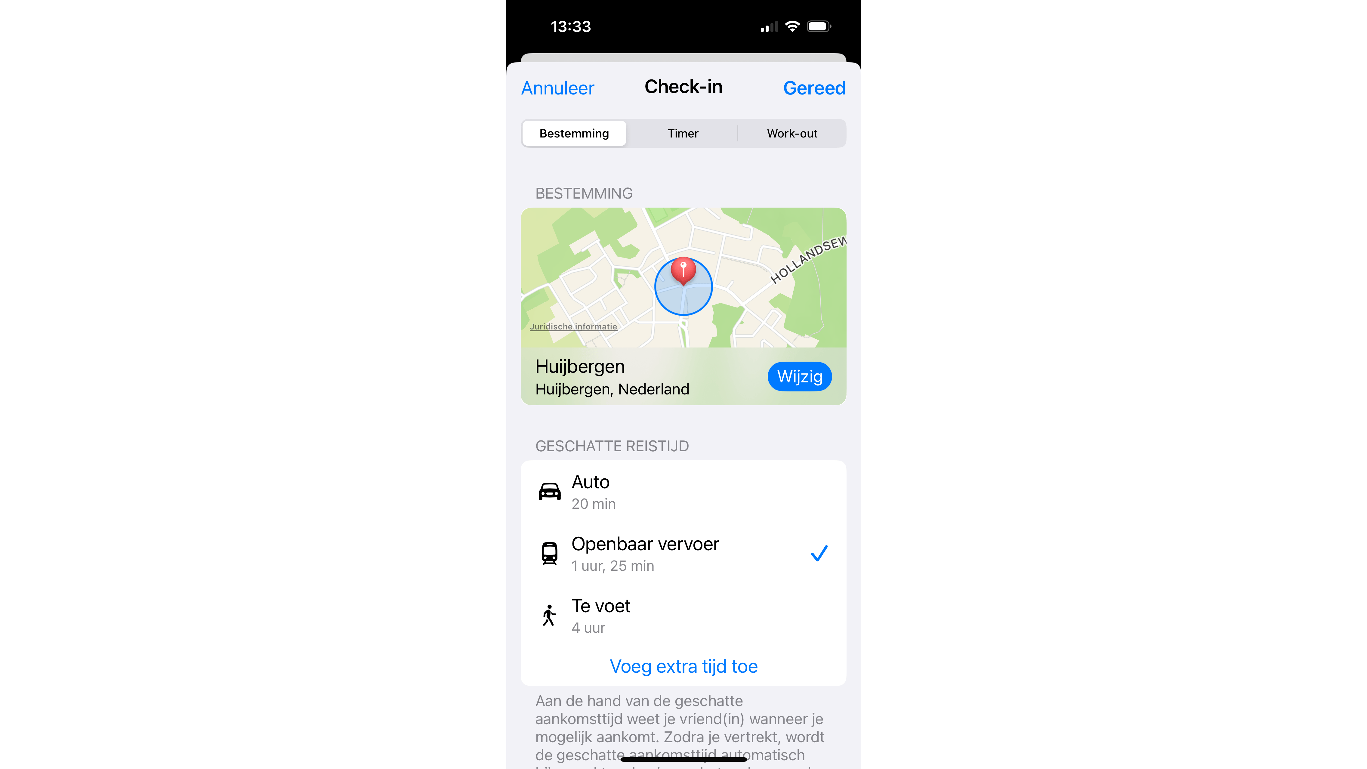 De andere persoon zal verschillende meldingen ontvangen: wanneer de sessie begint, wanneer je aankomt en als je vertraging hebt. Zelfs wanneer je iPhone een langere tijd offline is, zal er automatisch een melding verzonden worden. Standaard werkt Check-in met een timer waarin je aangeeft hoelang je onderweg denkt te zijn. Tik op Wijzig om deze duur aan te passen. Het is ook mogelijk een melding te versturen op basis van de locatiegegevens. In dat geval moet je in een volgend scherm het adres invullen waar je naartoe gaat. Op de kaart verschijnt een cirkel die je op drie groottes kunt instellen. Op die manier bepaal je de actieradius waarop Check-in zich zal baseren om te melden dat je bent gearriveerd. Je kunt ook aangeven met welk vervoermiddel je reist.