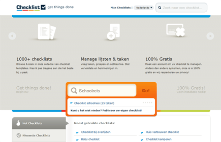 Het idee achter Checklist.com is even eenvoudig als briljant, want wanneer men dit soort lijsten op een centrale plek online bewaart en telkens verbetert en bijwerkt, ontstaan er natuurlijk zeer complete lijstjes, over de meest uiteenlopende onderwerpen. Het maakt dus niet uit of u van plan bent om te gaan trouwen, op vakantie te gaan, te verhuizen, een 10-minutengesprek moet aangaan, veilig wilt barbecueën enzovoort, want u kunt het zo gek niet bedenken of iemand anders heeft er al een lijstje voor gemaakt. Wanneer u de site opent, ziet u een groot zoekveld in beeld waarmee u kijkt of de gewenste checklist al aanwezig is. Extra prettig is dat de site zowel Engels- als Nederlandstalig is, zodat u ook lijstjes vindt voor typisch Nederlandse zaken.