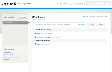 Het openen en afdrukken van een checklist kunt u doen zonder een account aan te maken. Maar de site biedt u ook de mogelijkheid om bestaande checklists aan te passen, bijvoorbeeld als bepaalde punten voor u niet relevant zijn. Om dit te doen dient u wel een account aan te maken. De eenvoudigste manier om dit te doen is klikken op Mijn Checklists bovenin en vervolgens op Registeer hier. Zodra u uw gegevens hebt ingevoerd bent u direct ingelogd. Eenmaal ingelogd kunt u bestaande checklists bewerken, maar ook uw eigen lijstjes aanmaken. Zeer handig is dat, wanneer u klikt op Mijn Checklists bovenin, en u typt de naam van de checklist die u wilt maken, de site direct aangeeft of er al lijstjes zijn die hierop lijken. Dat voorkomt dat u alsnog onnodig werk verricht. Maakt u zelf een lijstje, dan zijn er twee knoppen die van belang zijn. Met + Groep voegt u een verzamelnaam toe (bijvoorbeeld iets als: Regelen per telefoon of Regelen per post. En met + Taak voegt u taken toe aan een groep. Bent u klaar met de checklist, dan kunt klikken op de knop Delen om anderen uit te nodigen uw checklist te bekijken of de checklist te embedden.