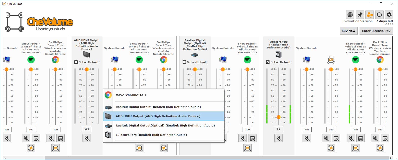 In CheVolume koppel je eventueel een openstaand programma aan een geluidsuitgang. Zo speel je op de pc-speakers bijvoorbeeld een Spotify-afspeellijst af, terwijl je via de hoofdtelefoon even een instructiefilmpje op YouTube beluistert. Op die manier is het niet nodig om de Spotify-stream te pauzeren voor het bekijken van een filmpje. Je opent de uitgebreide instellingen van CheVolume door eenmaal op het pictogram te klikken, waarna je de Advanced Used Mode activeert. Het programma herkent welke openstaande programma’s er allemaal een audiostream hebben, inclusief de systeemgeluiden van Windows. Gebruik de pijltjes onderin om een audiostream naar een andere audio-output over te hevelen. Dit werkt in de praktijk uitstekend!