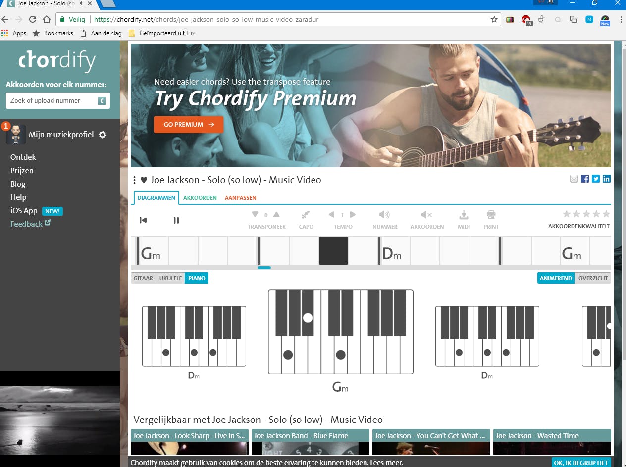 aar aanleiding van onze bespreking van Riffstation (Voor Nop 2017/03) tipte Ferry Visser ons over de uitstekende concurrent Chordify voor iedereen die graag de akkoorden van een nummer wil achterhalen om het te kunnen meespelen. De gratis versie van deze dienst kan de akkoorden achterhalen van nummers die te vinden zijn op YouTube, Deezer en Soundcloud – en dat zijn er nogal wat. Net als Riffstation komt ook Chordify niet verder dan drieklanken, maar wat testjes gaven de indruk dat Chordify wel accurater is. Wilt u spannender functies zoals transponeren of het tempo aanpassen, dan is er de betaalversie.