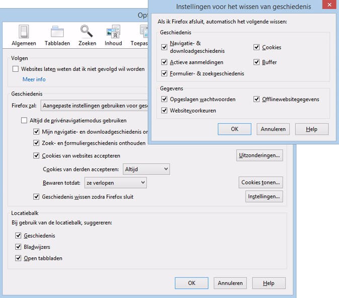 Firefox heeft veel mogelijkheden als het gaat om je privacy. Je kunt de dingen die de browser van je onthoudt tot in het kleinste detail bepalen. Druk op de Alt-toets, kies Extra / Opties en ga naar het tabblad Privacy. In dit scherm vind je meerdere opties. Lees ze goed door en geef aan wat je wilt laten schoonmaken. Plaats een vinkje bij Geschiedenis wissen zodra Firefox sluit en klik hierachter op Instellingen. Hier kun je precies aanvinken welke items Firefox automatisch moet vergeten bij het afsluiten.