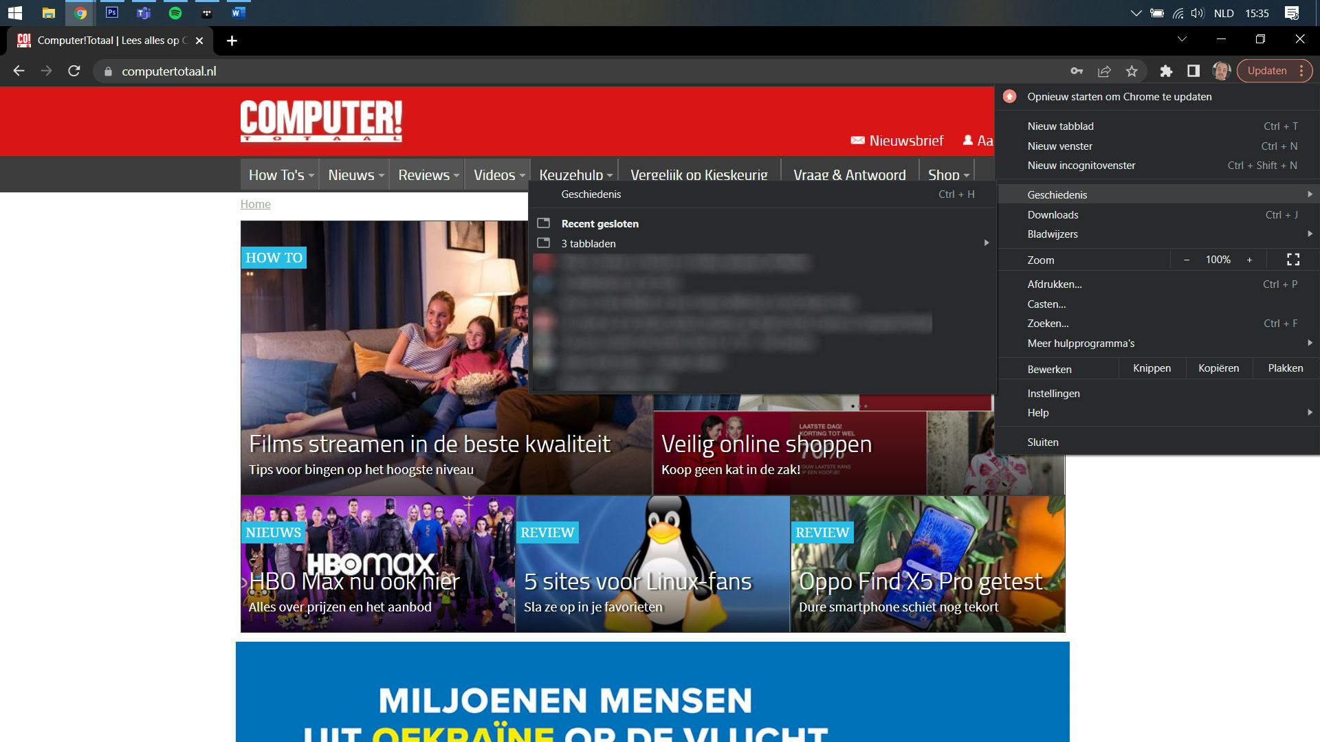 Wanneer je per ongeluk een Chrome-venster met heel veel tabs sluit, dan kun je ze allemaal terughalen via het menu. Druk op de drie puntjes rechts in beeld en selecteer de knop Geschiedenis. Houd je muisaanwijzer op Geschiedenis, totdat er een nieuw menu verschijnt met recent gesloten tabbladen.
