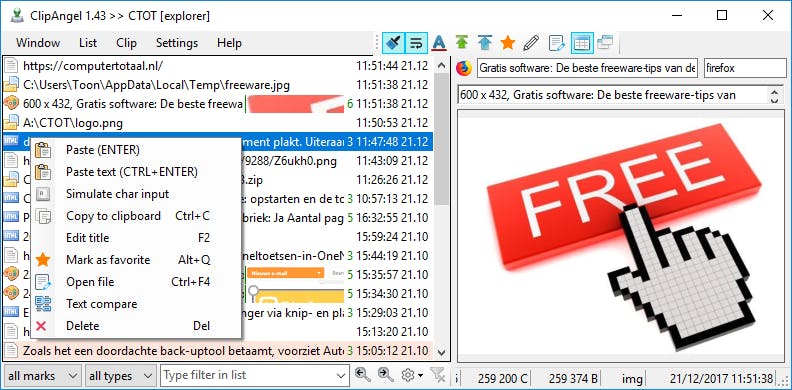 Zodra je nu met Ctrl+C een item naar het Windows klembord stuurt, werpt ClipAngel zich als tussenpersoon op: alle items (hier clips genoemd) belanden automatisch in de database van ClipAngel.