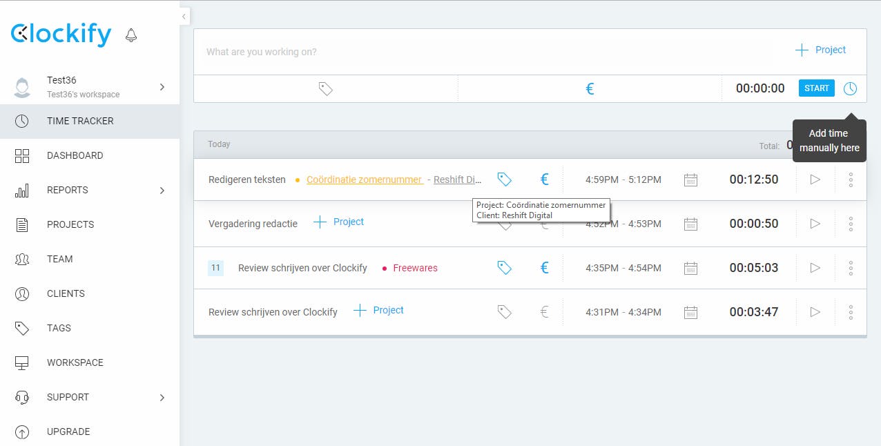 Clockify is een eenvoudige tool waarmee je vlot je werktijd kunt registreren. Dankzij de uitgebreide webapplicatie ben je niet aan een specifieke computer gebonden. De gratis versie is behoorlijk flexibel, met ondersteuning voor projecten, cliënten en tags. Voor meer extra’s heb je een betaalde variant nodig (vanaf 10 USD per maand).