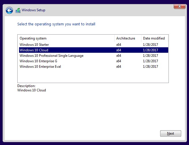 Computer!Totaal wist een kopie van de installatie-dvd (ISO) van deze speciale Windows 10 Cloud-versie (build 15025.1000) te bemachtigen. Tijdens de installatie konden we kiezen uit de Cloud-versie van Windows 10.