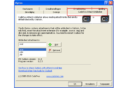 Met CodeTwo Attach Unblocker is het eenvoudig om uitzonderingen toe te voegen aan de lijst met bijlagen die MS Outlook als gevaarlijk beschouwt. Hierdoor wordt het bijvoorbeeld mogelijk om een exe-bestand te ontvangen. Dit type bestand wordt standaard geblokkeerd, net als onder andere vbs-, url- en reg-bestanden. Open de opties van MS Outlook en vervolgens het tabblad CodeTwo Attach Unblocker. Geef in het veld Unblocked attachments (gedeblokkeerde bijlagen) het type bestand op waarvan u de blokkade wilt opheffen, bijvoorbeeld 'exe'. Als u met de knop Add bevestigt, wordt het 'bijlageslot' voor dit type bestanden opgeheven.