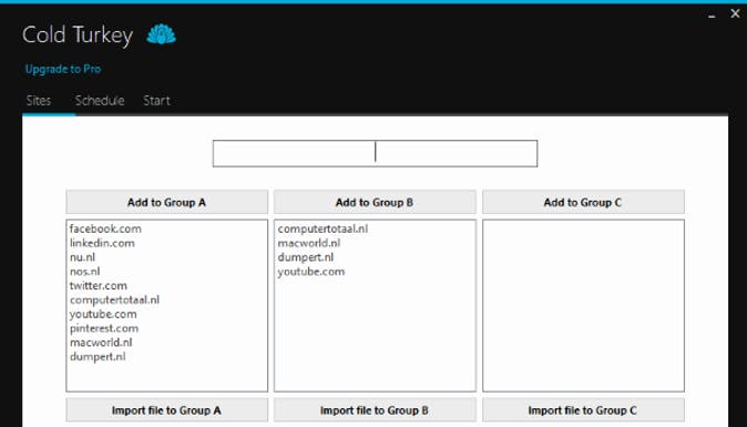 Nadat je de tool hebt gedownload, kun je websites in drie groepen onderverdelen. Als groep schakel je de websites later uit. In sommige situaties kan het handig zijn om bijvoorbeeld nieuwssites ingeschakeld te houden en voeg je in Groep B die sites niet toe. De groepen die je aanmaakt blijven bewaard, maar je kunt ze niet los opslaan. Wil je dus meer dan drie scenario's creëren, dan ontkom je er niet aan om de eerder gemaakte groepen aan te passen. Het is wel mogelijk om een tekstdocument met daarin de websites te importeren in Cold Turkey. In de PRO-versie van het programma, waar je eenmalig iets meer dan dertien euro voor betaalt, kun je zelfs het hele internet platleggen door *.* toe te voegen aan een groep.