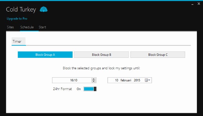 Cold Turkey ----------- **Prijs** Gratis ($14,99 voor de PRO-versie) **OS** Windows XP/Vista/7/8 **Website** [getcoldturkey.com](http://getcoldturkey.com)
