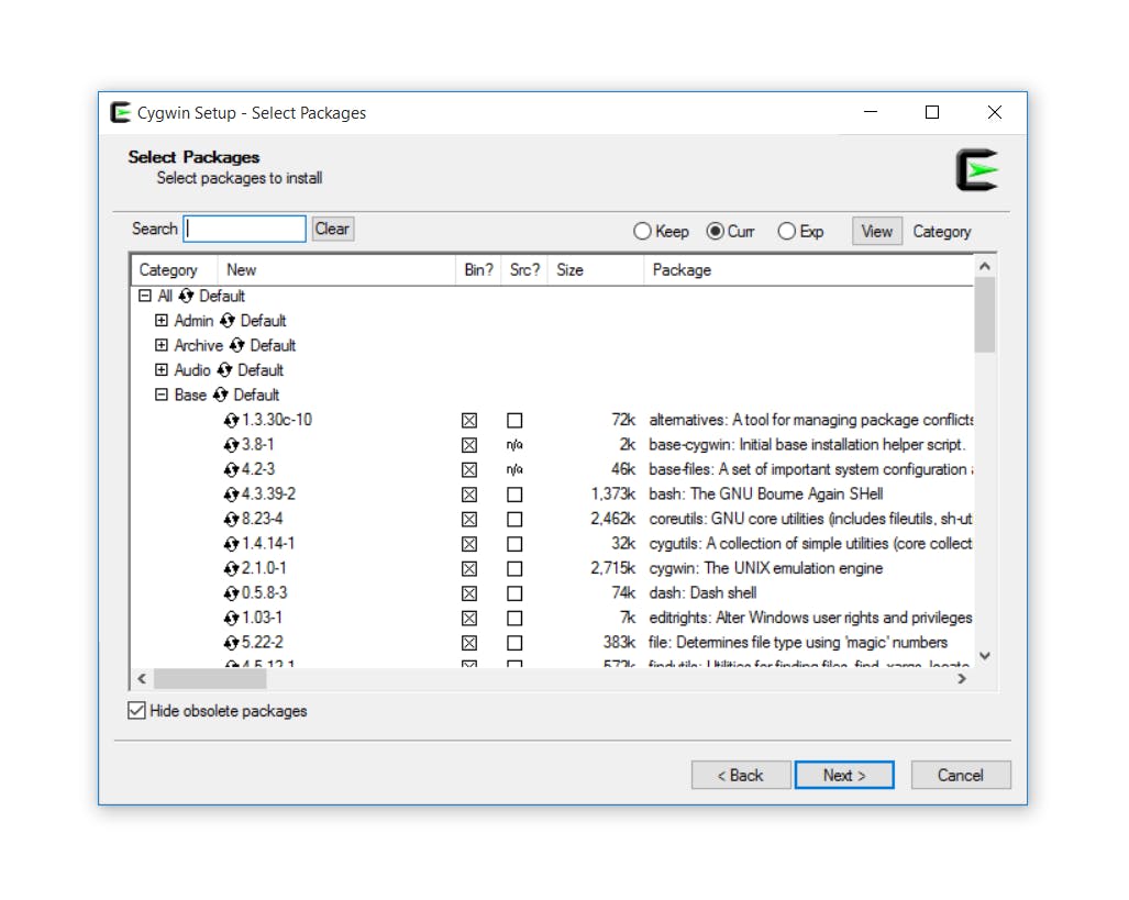 We downloaden het programma vanaf de website, kies even voor de 32 of 64 bit-versie en haal de .exe binnen. Na het starten van de installatie kun je een aantal keer klikken op Volgende. De standaardinstellingen zijn prima. Op een gegeven ogenblik moet je een Download Site kiezen. We raden aan een mirror bij je in de buurt te kiezen, zoals die van de Universiteit Twente eindigend op utwente.nl, onderaan in de lijst. Klik op Volgende en al snel zal je de keuze moeten maken welke packages je wilt installeren. De lijst komt misschien wat indrukwekkend over. Je hoeft nu niet meteen de keuze te maken, achteraf kan nog het een en ander worden toegevoegd. Voor nu gaan we hier geen wijzigingen in aanbrengen: de standaarden zijn voldoende. Na nog een keer op Volgende te hebben geklikt, start het downloaden. Is dat eenmaal klaar, dan kun je de installatie sluiten en Cygwin starten.