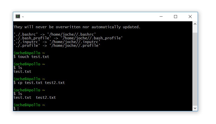 Om snel een leeg tekstbestand aan te maken, gebruik je touch test.txt. Er wordt dan een bestand test.txt in dus C:\Cygwin\home\Jochem geplaatst. Als je het command ls (kort voor list) typt, krijg je een overzicht van alle bestanden in de huidige map. Doe je dat nadat je het .txt-bestand hebt aangemaakt, dan zie je dat bestand in de lijst staan.